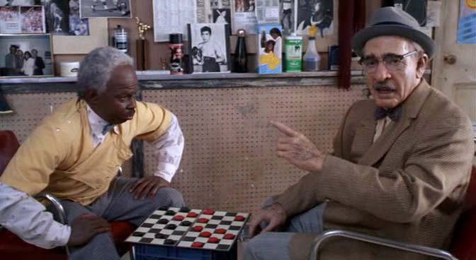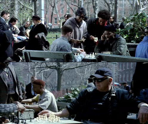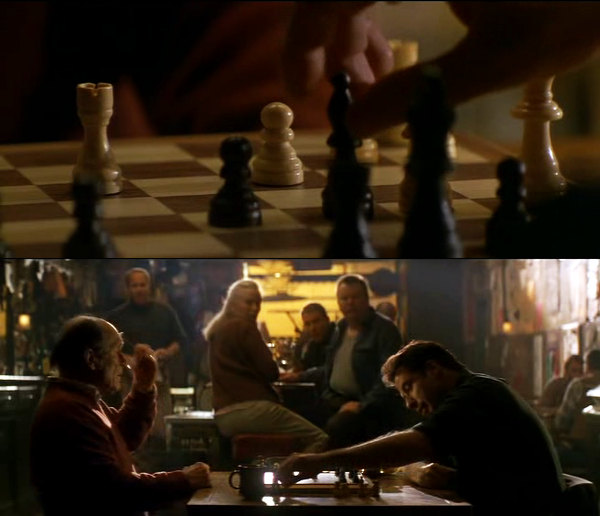 | Šachy | Modrá ocel (Blue Steel, 1989, USA) | Na začátku filmu dokresluje atmosféru newyorských ulic pohled na dva starší muže hrající šachy. |