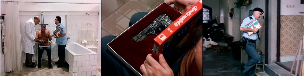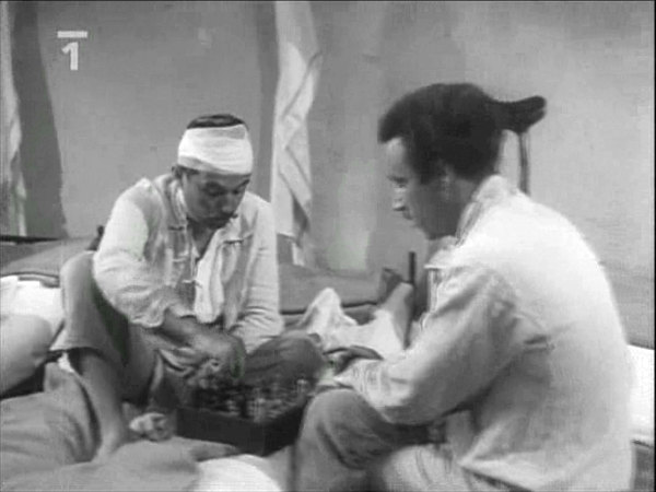 | Šachy | Návrat sedmé roty (On a retrouvé la 7e compagnie, 1976, Fr) | Zatímco hlavní hrdinové využívají fintu s matracemi a mizí v tajné chodbě zámku, jejich velitel hraje šachy s velitelem německé osádky. Na hru je třeba klid a ticho a jeden by neřekl, kolik hluku může způsobit i opatrné otevírání krabičky zápalek... (obrázek) |