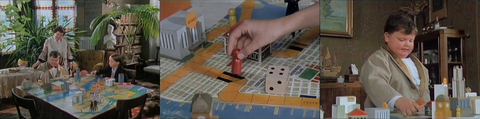 | Monopoly | Bylo nás pět (2/6) (1994, ČR) | Petr Bajza hraje u továrníkových Monopoly s Otakárkem. Ten je ve svém živlu, ale podvádí, což Péťa těžce nese. Ota: „Koupíš zámek?“ – Péťa: „Ne, já šetřim. Krize je na krku a co pak rodina? Na dluh mi dneska nikdo nedá.“ – Ota: „Seš podělanej škrob.“ (obrázek) |