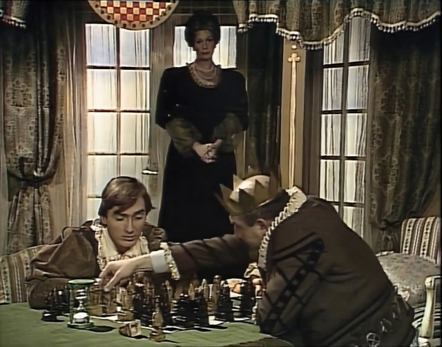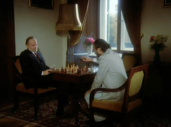 | Šachy | Anička s lískovými oříšky (1993, ČR) | Král Štěpán (J. Čenský) má monolog ke svému začarovanému bratru (M. Stránský) nad partií šachu. |