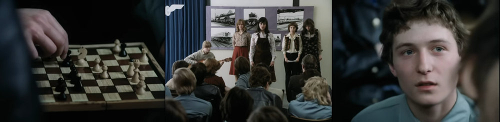 | Šachy | Housata (1979, ČR) | Film líčí příběhy několika dívek z internátu. V závěru filmu recitují dívky na kulturní akci, zatímco dva chlapci v publiku hrají šachy. Jeden z nich je recitující dívkou tak fascinován, že zapomene na hru. A tak mezi chlapci dojde k zajímavému dialogu. (obrázek) |