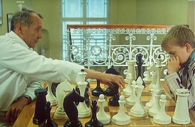 | Šachy | Saturnin (1994, ČR) | D. Oulický (O. Havelka) hrál s dědečkem (L. Lipský) šachy, ten se ale nemohl soustředit, jelikož teta Kateřina (J. Synková) mu stále starostlivě a poněkud neodbytně nosila nabízet nějaké jídlo. Dědeček pak prováděl opravdu prapodivné tahy... (obrázek) |