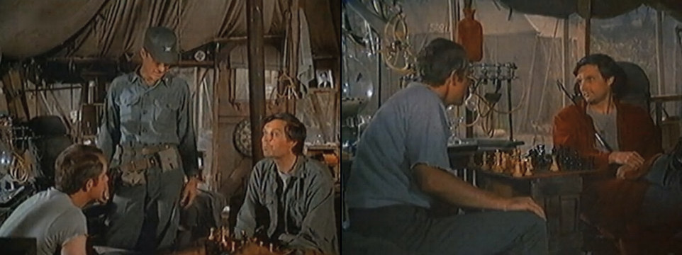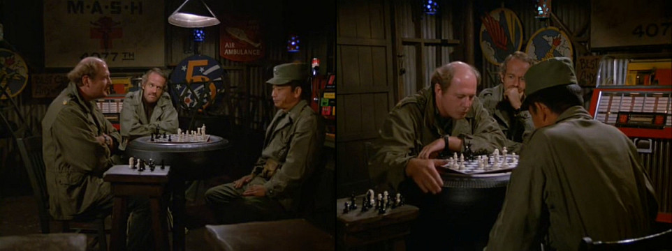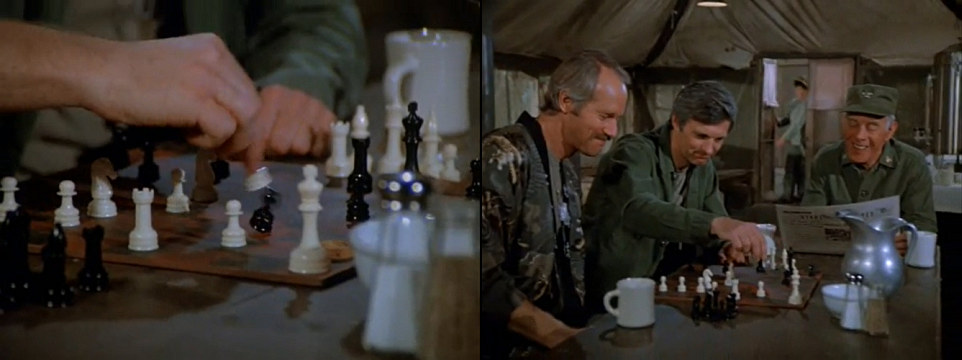 | Šachy | M.A.S.H.: Partyzánské sny (176/256) (M*A*S*H: Guerilla My Dreams, 1979, USA) | Hawkeye a B. J. mají starosti s raněnou Korejkou a přísným jihokorejským důstojníkem, který přirovnává válku k šachům. Major Charles Winchester jej pozve hrát skutečné šachy. Jenže se mu vůbec nedaří, a tak zkouší svého soupeře alespoň rušit. (obrázek) |