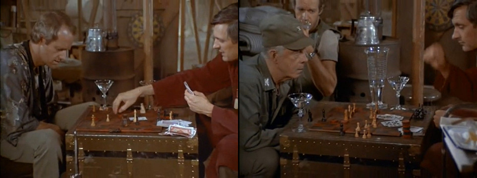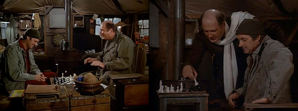 | Šachy | M.A.S.H. (M*A*S*H, 1972, USA) | V jednom dílu hraje major Winchester s někým v důstojnickém klubu, a když prohrává, tak shodí hrací desku ze stolu. |