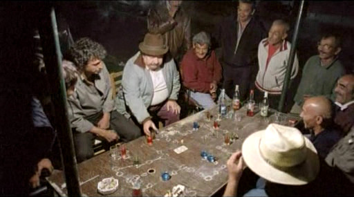 | Šachy (nakonec jen domino) | Anděl na horách (1955, ČR) | Gustav Anděl (J. Marvan) přemlouvá kamaráda Bohouše Vyhlídku (J. Kemr), aby vyzval k tanci jednu slečnu a vyzvěděl s kým chodí. Myslí si totiž, že je snoubenkou jeho syna. Předstírají, že hrají domino (není desková hra), ač byla původně řeč o šachu. (obrázek) |