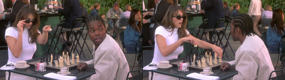 | Šachy | Láska s výstrahou (Two Weeks Notice, 2002, USA) | Šachy jsou zmíněny ve filmu několikrát. June (A. Witt) a George (H. Grant) dokonce hrají svlékací šachy. (obrázek) |